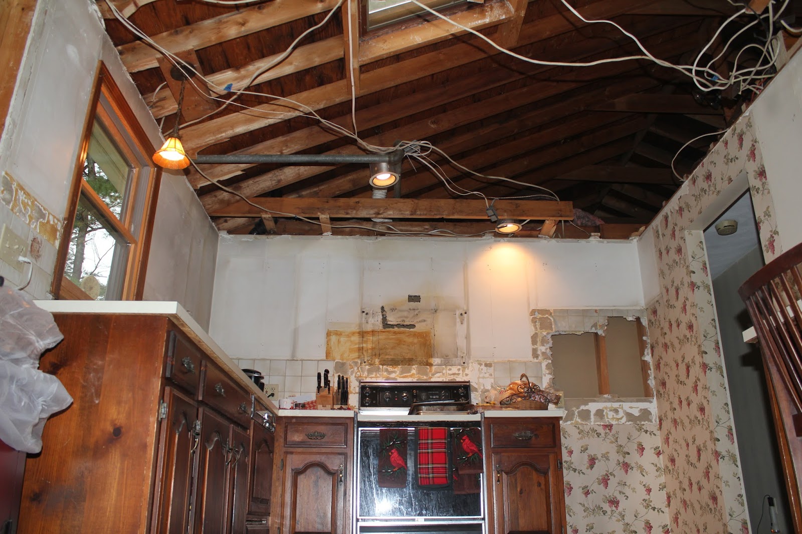 Joists, strapping, and skylight framing removed from over the kitchen.